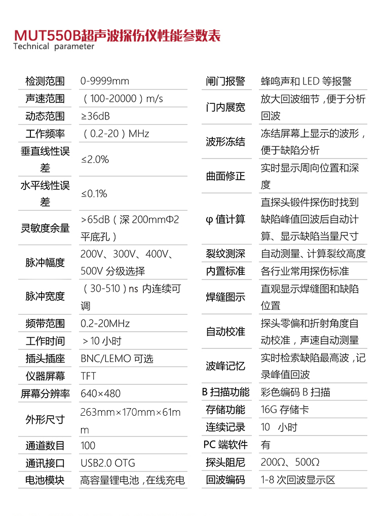 產(chǎn)品概述MUT550B數(shù)字式超聲波探傷儀依據(jù)超聲傳播原理,可精準、靈敏地進行工件內(nèi)部多種缺陷(裂紋、夾雜、氣孔等)的檢測、定位、評估和診斷。采用全數(shù)字TFT640×480真彩色液晶顯示屏,在光線昏暗及日光強烈環(huán)境下都能為您呈現(xiàn)清晰缺陷;0-9999mm大量程可滿足制造業(yè)、鋼鐵冶金業(yè)、金屬加工業(yè)、化工業(yè)等常規(guī)的缺陷檢測需求;低功耗設(shè)計配備大容量高性能鋰離子電池模塊可連續(xù)工作10小時以上;全中文主從式菜單,注重用戶體驗,集快捷按鍵、數(shù)碼飛梭旋輪、十字菜單三種操作方式于一體,不同使用習(xí)慣均可操作自如;設(shè)有綜合性能指標自檢功能,可自動生成測試報告,支持多語言。該產(chǎn)品具有很高的性價比,是實用經(jīng)濟款超聲檢測儀器的明智之選。
